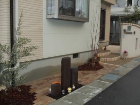 落ち着いた雰囲気の建物、そして既存の石積みなどと調和するようにミカゲの化粧ブロックを門柱及び外周に用いました。門扉、フェンス(いずれも新日軽・セレビューRシリーズ)はブラックにして、重厚感のある落ち着いた雰囲気になりました。