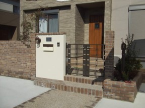 塗仕上げの壁にレンガの笠木を組み合わせて明るく柔らかいデザインにしました。 花壇も作ったのでガーデニングも楽しめますね。
