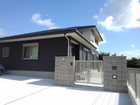 お家の存在感に合ったかっこいい外構が完成しました。家のサッシの色に合わせてエクステリア商品のカラーは全てブラックで統一。ガレージ部分は全て土間コンクリート仕上げにして雑草に悩まされることもありません。ブロックはユニソンのアルタ(色:シャドーブラウン)を使用しています。表面がランダムな凹凸デザインになっていて、奥行き感があるおしゃれな化粧ブロックとなっています。